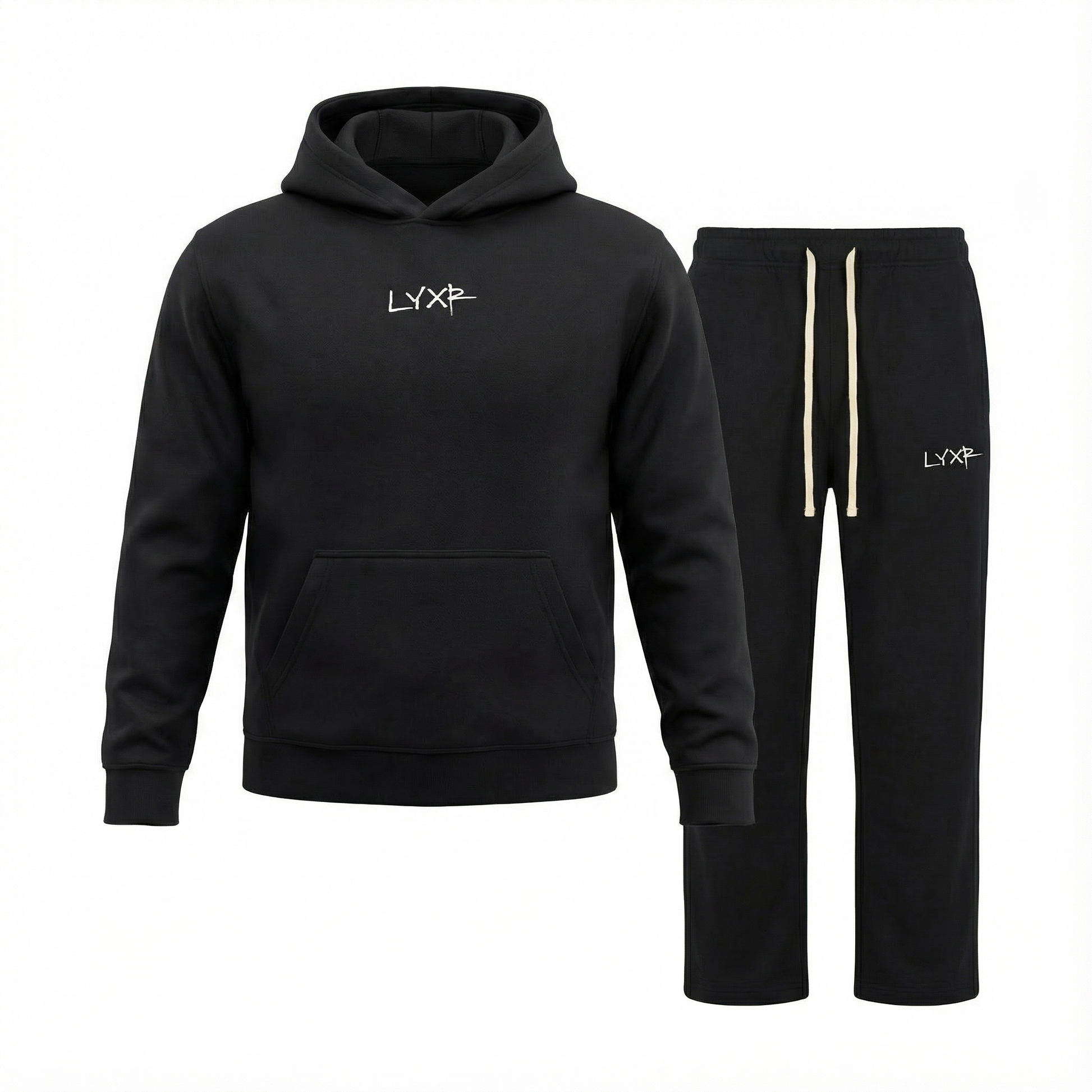 The oversized fit provides a relaxed, straight silhouette with natural drape. The hoodie features a dropped shoulder, hood down, and straight sleeves, while the sweatpants offer a straight-leg, relaxed fit with a clean and even crotch area. Both pieces maintain clean proportions and are designed for effortless layering or standalone wear.