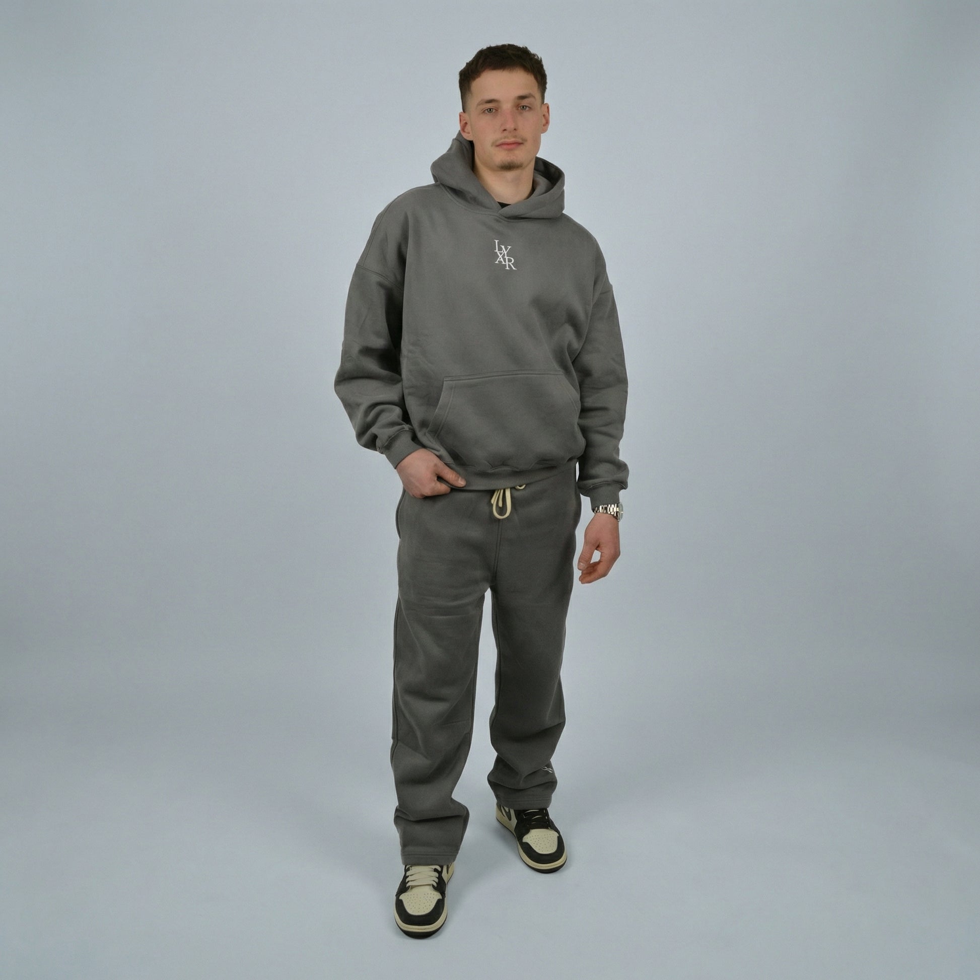 The oversized fit provides a relaxed, straight silhouette with natural drape. The hoodie features a dropped shoulder, hood down, and straight sleeves, while the sweatpants offer a straight-leg, relaxed fit with a clean and even crotch area. Both pieces maintain clean proportions and are designed for effortless layering or standalone wear.